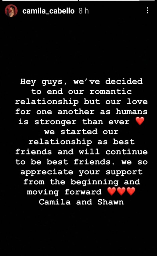 “Hey guys, we’ve decided to end our romantic relationship but our love for one another as humans is stronger than ever. We started our relationship as best friends and will continue to be best friends. We so appreciate your support from the beginning and moving forward. Camila and Shawn,” tulis Camila dan Shawn di story Instagram.