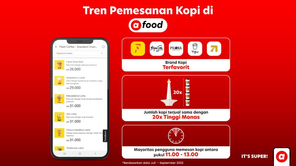 GETPOST.ID, Jakarta- Airasia food memberikan solusi yang lebih praktis bagi para penikmat kopi dengan mobilitas tinggi. Dalam kurun waktu tiga bulan terakhir, airasia food melihat kopi sebagai salah satu menu terpopuler di kalangan pengguna. Head of Marketing airasia Super App Indonesia Boni Andika menuturkan dalam siaran pers, Senin 17 Oktober 2022, “Selain menu martabak, bakmi, bakso, dan burger, kopi masuk dalam jajaran lima menu terpopuler yang paling banyak dibeli oleh pengguna airasia food. Melihat besarnya antusiasme masyarakat terhadap minuman kopi, maka airasia food turut memfasilitasi dengan sejumlah kampanye promo, seperti Super Merchant Sale yang menawarkan Diskon 60%. Melalui promo ini, kami berharap masyarakat dapat menikmati kopi beserta ragam kuliner favorit mereka secara lebih praktis dan terjangkau.”