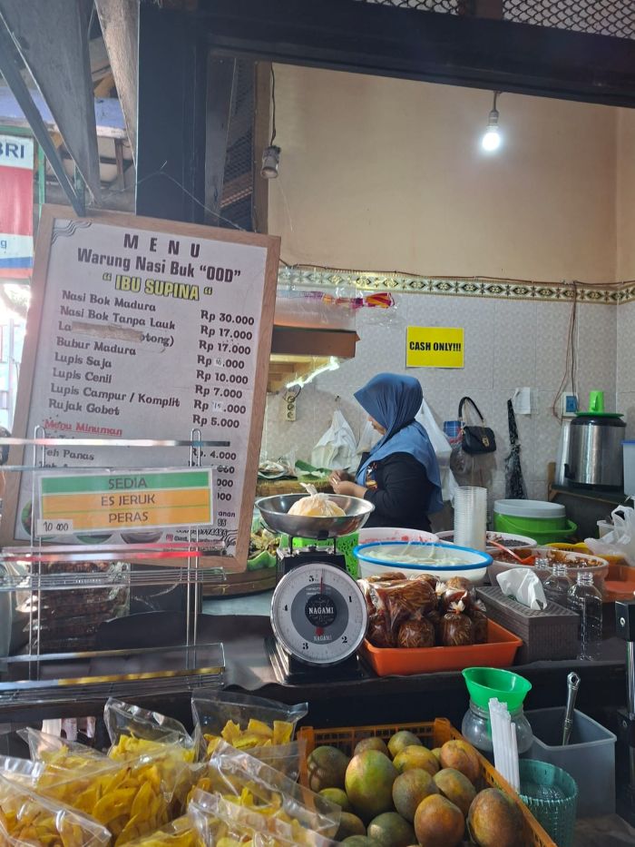 Lokasi kedainya di depan pintu masuk. Meski bertuliskan warung nasi tapi justru yang diincar di kedai ini adalah buburnya. Tersedia mulai dari bubur Madura, lupis, cenil, bubur ketan hitam dan bubur sumsum. Untuk nasi kedai ini menjual nasi bok Madura.