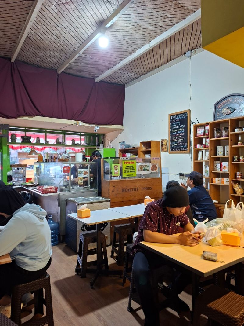 Kedainya didominasi warna hijau, dibuat unik jadi pengunjung bisa masuk dari 2 pintu arah dalam dan luar. Pagi itu kedainya ramai, banyak pengunjung yang sarapan. Tersedia mulai dari kopi tubruk sampai tahu telor yang menjadi khas kuliner Malang. Tersedia pula gudeg, dawet, nasi gandul, soto bnjar, cincau hijau, rawon, garang asem, ayam kremes dan lainnya. Harga mulai dari Rp12 ribu