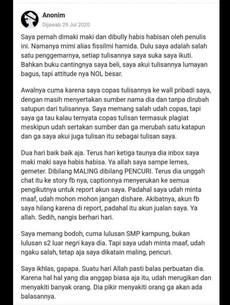 Satu tahun lebih saya mengutuk diri sendiri. Saya memaki diri sendiri krn merasa bodoh. Saya menyalahkan diri saya sendiri krn menyalin tulisan kamu dan berujung dgn hilangnya akun saya. Satu tahun lebih saya menyimpan trauma dan benar benar hengkang dari media sosial.
