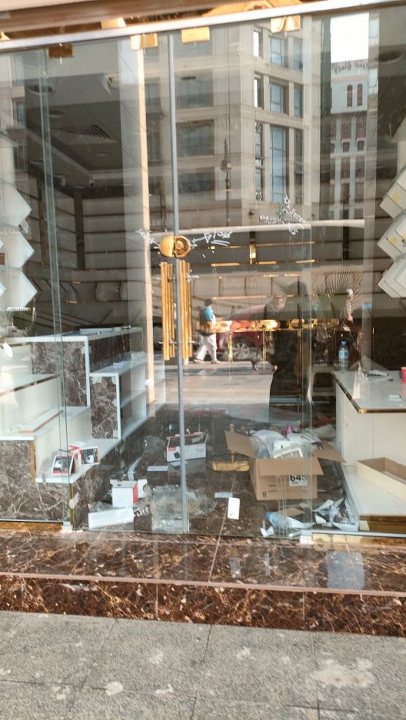 GETPOST.ID, Madinah– Kota Madinah, terutama yang berada di kawasan sekitar Masjid Nabawi terlihat masih terkena dampak pandemi selama 2 tahun terakhir. Di dekat pintu utama Masjid Nabawi, masih terlihat beberapa toko yang tutup. Bahkan toko yang tidak ditutupi oleh rolling door dan hanya ditutupi oleh kaca, terlihat sekali berantakan.