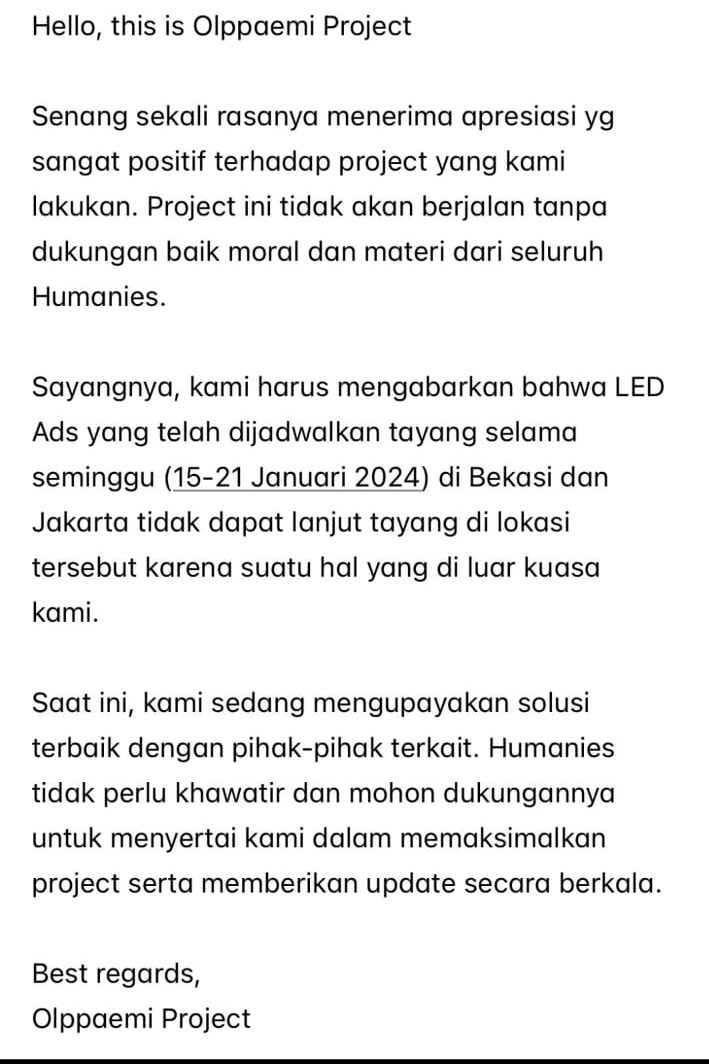“Senang sekali rasanya menerima apresiasi yang sangat positif terhadap project kami lakukan. Project ini tidak akan berjalan tanpa dukungan baik moral dan materi dari seluruh Humanies. Sayangnya kami harus mengabarkan bahwa LED Ads yang telah dijadwalkan tayang selama seminggu (15-21 Januari 2024) di Bekasi dan Jakarta tidak dapat lanjut tayang di lokasi tersebut karena suatu hal yang di luar kuasa kami,” tulis @olpproject di X.