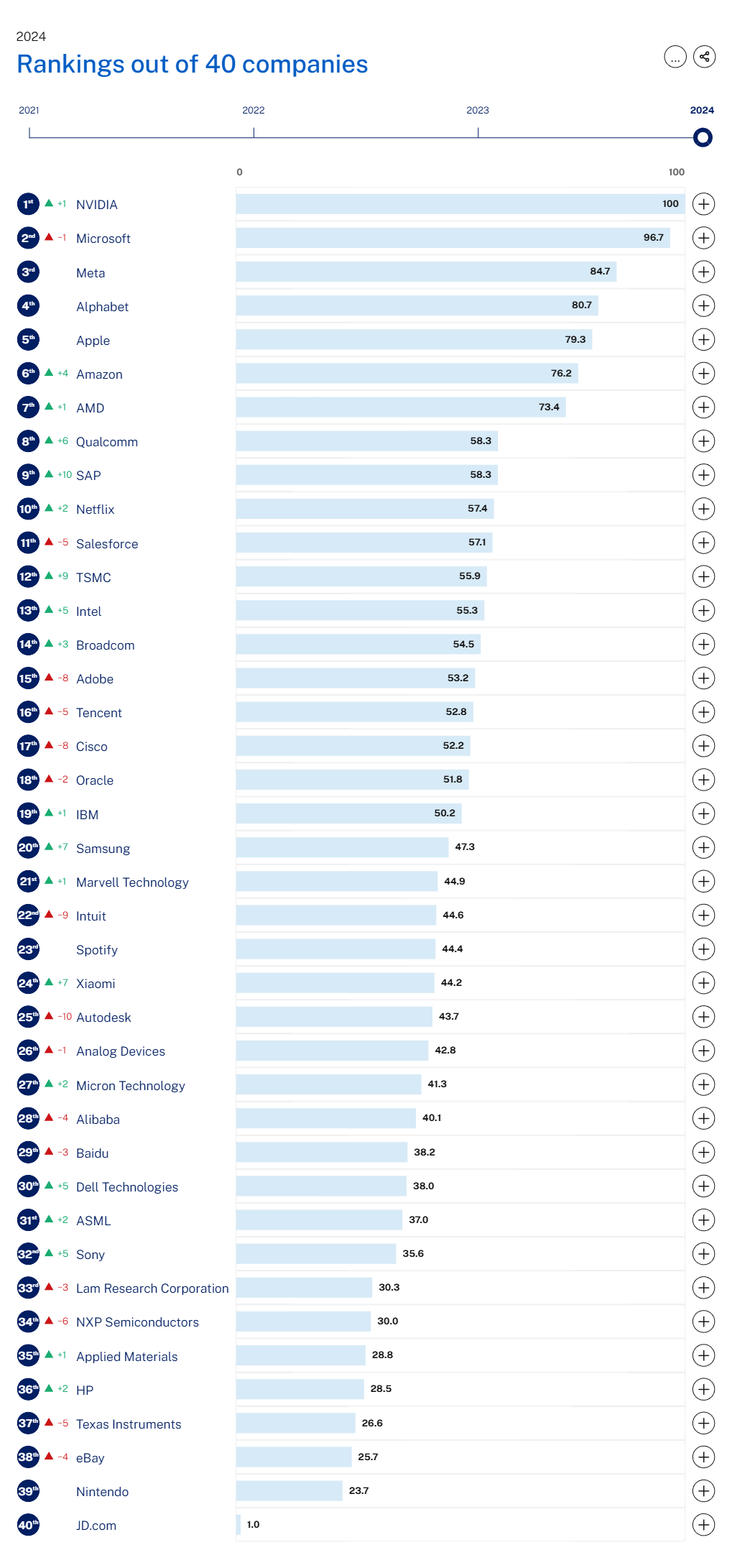 Selain nama-nama perusahaan teknologi asal Amerika Serikat, sejumlah nama perusahaan teknologi asal Asia juga masuk dalam daftar, seperti TSMC (12); Tencent (16), Samsung (20); Xiaomi (24); Alibaba (28); Baidu (29); Sony (32), Nintendo (39); hingga JD.com (40).