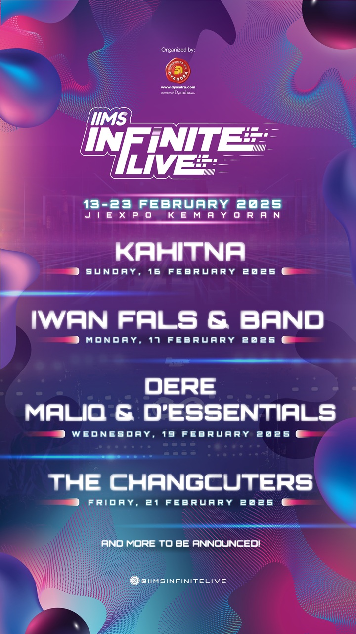 Lineup fase pertama IIMS Infinite Live 2025 dimeriahkan para musisi besar lintas masa dan genre, seperti Iwan Fals, The Changcuters, Maliq & D’Essentials, Kahitna, hingga Dere.