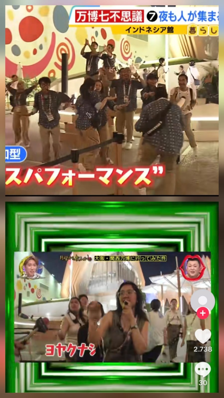“Tujuh Keajaiban Expo: Paviliun yang penuh sesak dengan pesta dansa di malam hari,” kata sebuah akun warga Jepang yang memposting ulang liputan Paviliun Indonesia di salah satu TV di Osaka.