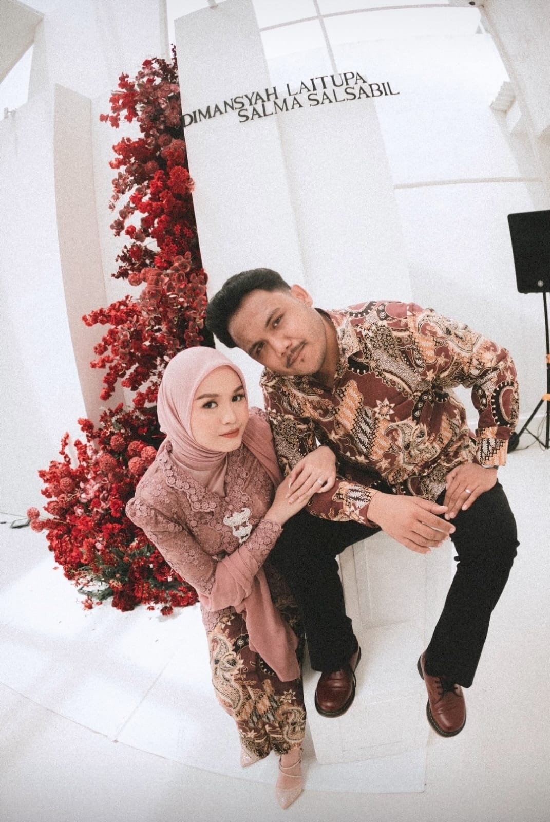 Penyanyi asal Probolinggo itu tampak cantik mengenakan kebaya merah muda dengan bawahan kain batik dipadukan dengan kerudung warna senada. Sementara itu, Diman terlihat mengenakan kemeja dengan motif batik serupa dengan kain yang dikenakan Salma.